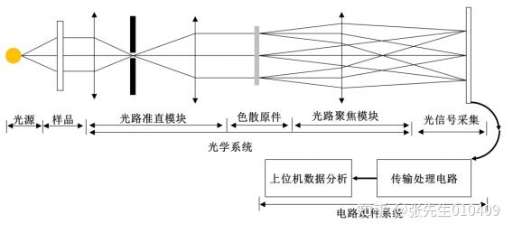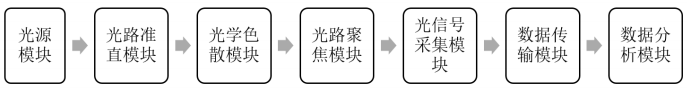 光谱仪系统地结构主要有光源模块、光路准直模块、光学色散模块、光路聚焦模块,光信号采集模块以及光谱数据收集传输模块,现代光谱仪一般还会有光谱数据的后端处理模块。