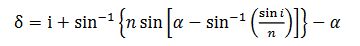 一束复色光入射到分光棱镜一个工作表面上,入射角为i,经过两个界面的折射后,在第二个工作面出射,出射光线的出射角为θ,若棱镜材料的折射率为n,且棱镜顶角为α,光线偏折角为δ,则棱镜色散公式为: